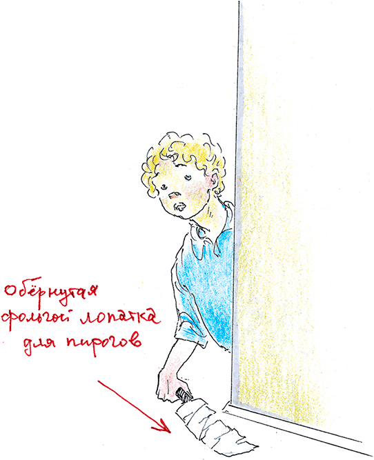 На самом деле в руке у него был не нож, а обёрнутая фольгой лопатка для пирогов, которую он ловко зажал под мышкой. Он чуть-чуть полежал на полу, надеясь, что бабушка закричит или зарыдает. Но было тихо. Тёма забеспокоился. Может быть, ей стало плохо?
