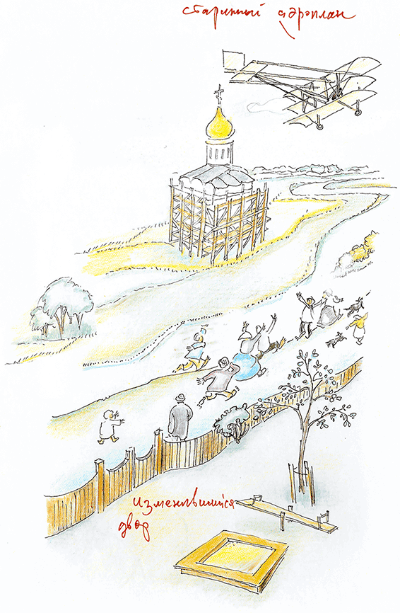 Аэроплан летел вдоль реки. За ним по берегу неслась ватага мальчишек – почти все босиком, в холщёвых штанах и рубашках навыпуск. Река была та же – но вместо новых домов на горизонте повсюду сверкали разновеликие купола церквей. Единственным, что не изменилось, был заросший зеленью островок и старая церковь в строительных лесах на другом берегу. Правда, теперь леса эти светились свежим светлым деревом.