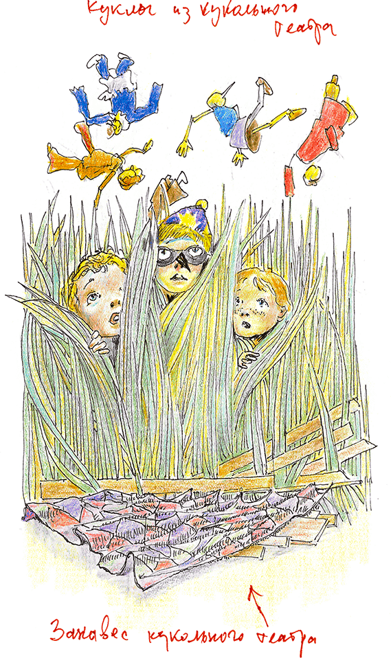 Там, в глубине, виднелся разломанный театр с ярко раскрашенным занавесом, разорванным на куски. Всюду валялись деревянные палки, колёса, верёвки. Стёпка с Маруськой стали поднимать с земли покорёженных кукол и куски декораций.