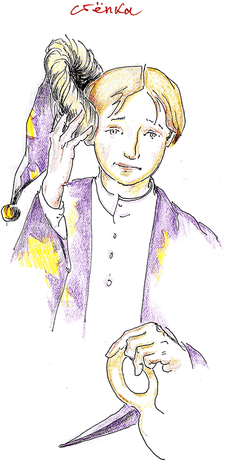 Испуганный Тёма бросился вслед за Звездочётом и девочкой. Они промчались через кухню (Тёма успел заметить дрова и огонь в кухонной печке на месте газовой плиты), выбежали на задний двор, пронеслись мимо конюшни, где фыркала весёлая рыжая лошадь, пробежали вдоль забора и залегли в густом бурьяне за сараем. Все трое тяжело дышали. Звездочёт содрал колпак и маску и оказался рыжим мальчиком примерно Тёминых лет. Девочка что-то хотела сказать, но мальчик приложил палец к губам.