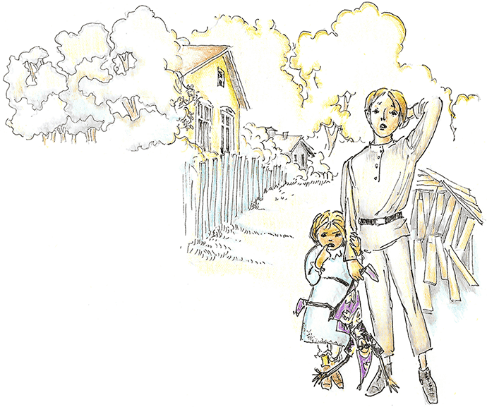 Стёпка, Маруська и Тёма встали из бурьяна. Стёпка стянул с себя балахон Звездочёта, вытер кулаком глаза. Теперь он был одет в брюки и светлую холщевую гимнастёрку с ремнём[4]. Ни на кого не глядя, Стёпка хмуро побрёл к сараю.