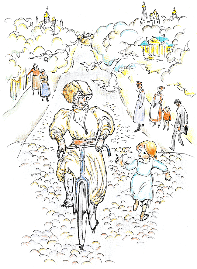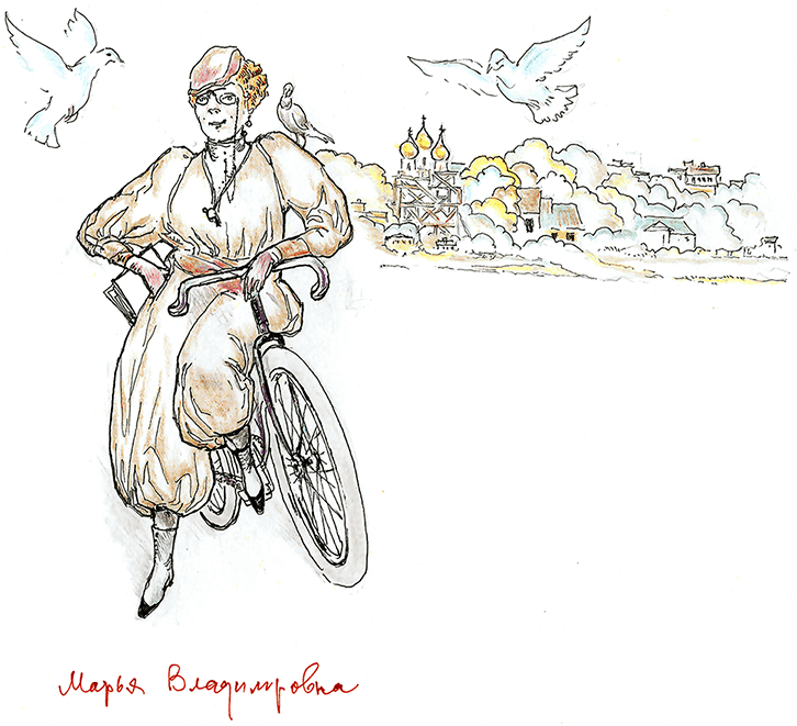 Марья Владимировна сунула Стёпке сумку с пачкой каких-то прокламаций, сняла у него с плеч Маруську и поставила её на землю, на лету чмокнув в щеку. Переливчато дунула в свисток, бойко разогналась, перекинула ногу и поехала. Стайка птичек выстроилась углом, как мотоциклетный эскорт, и полетела за ней.