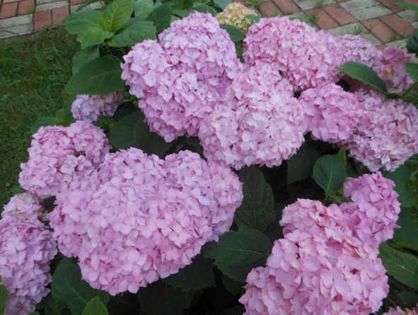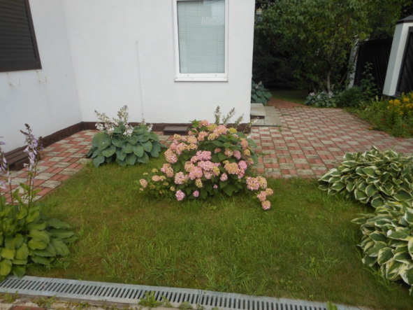 Как заходишь в калитку, под окном, бросается в глаза гортензия с розовыми бутонами, а вокруг, по углам газончика растут хосты.