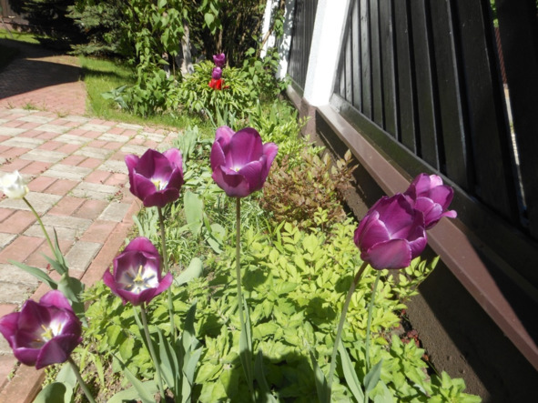 С правой стороны у забора узкий газон с тюльпанами и цветами.
