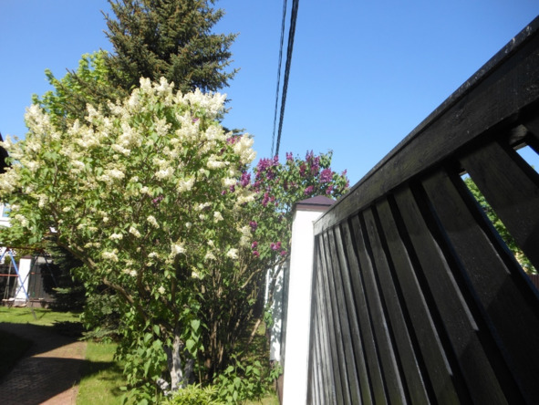 За ними, вдоль дорожки кусты сирени: первая белая и далее ещё две сирени сиреневого цвета.