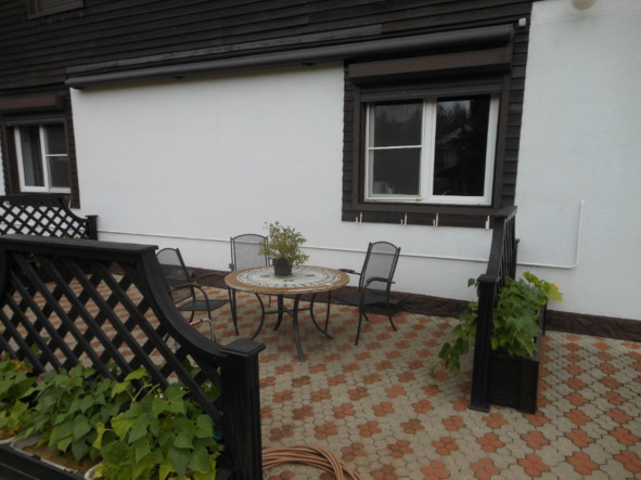 А в саду прямо под окнами кухни площадка летней веранды, огороженная заборчиками. Заборчики с ящиками под цветы внизу. Тут на веранде стол со столешницей из искусственного мрамора и стулья. И эта веранда закрывается выдвижным тентом.