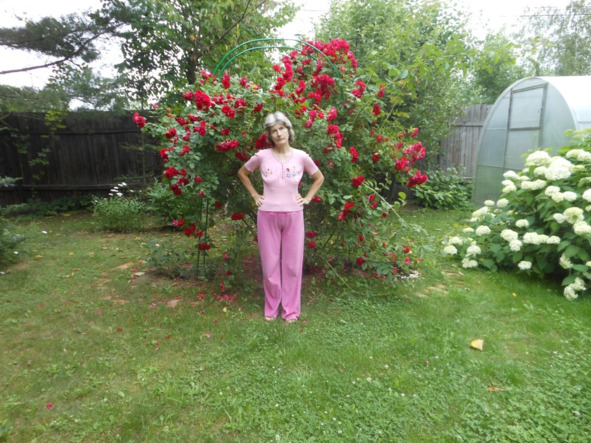 Напротив веранды, через зелёный газон. Цветёт плетистая роза, которая требует большого ухода. Розу надо на зиму убирать с железой арки, затем укрывать, заворачивать в материал, прижимать досками к земле, а она очень колючая.