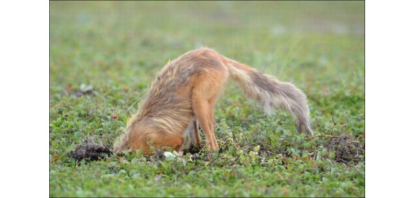 Не прошло много времени, рыжая лисица снова показалась из-за дерева в лесу. Оглядевшись, она опустилась, легла на землю, и ползком стала пробираться к крутому берегу реки. Приблизившись настолько, когда кружившие над берегом стрижи могли ее заметить, лисица замерла и прижалась, в траве ее почти не было видно. И так, рывками – то ползком, а то замирая, лиса добралась-таки до самого края крутого берега. Тут она долго лежала без движений. Она притворилась мертвой, и стрижи ее не замечали, – неподвижную рыжую хитрюгу. Оказывается, не просто так лежала лисица. Мне стало видно не сразу, как и стрижи ни о чем не подозревали. А лисица копала передними лапами песок у самого края крутизны. Берег был песчаный, и легко лиса докопалась до гнезда стрижей. Пострадали сразу несколько самых верхних гнезд на крутом берегу. Лисица, вдруг, резко поднялась и выхватывала из стрижиных гнезд маленьких птенчиков. Поднялась паника в стрижиной стае. Стрижи стали нападать на лисицу, резко падали и клевали рыжую в спину и в голову. А она же уворачивалась, но хватала и ела птенчиков из раскопанных гнезд. Все прошло быстро: или птенцы кончились или лисица не вытерпела, как стрижи клевали ее, один за одним нападая все чаще и быстрее. Она побежала к лесу, а за ней стая кружилась и нападала. Эта охота не окончилась. Минут через 15 – 20 лисица снова объявилась. Видимо, зализала раны и опять захотела есть.