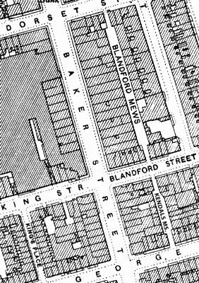Название Бландфорд-стрит носила восточная часть улицы, пересекавшей Бейкер-стрит примерно посередине, между номерами 15 и 16 (западная ее часть называлась Кинг-стрит). С Бландфорд-стрит можно было свернуть в один из двух узких и параллельных улице Бейкер-стрит проходов: Кендалл-мьюз на юге (между кафе Амлоса Суонелла и домом строителя Дейвида Бейкера) и Бландфорд-мьюз на севере (между домами портнихи мадам Мари и торговки зерном миссис Матильды Беннетт). Эти проходы можно увидеть на приведенном плане – термин mews использовался в то время для обозначения проулка или небольшой площади, окруженной домами, которые первоначально служили конюшнями.