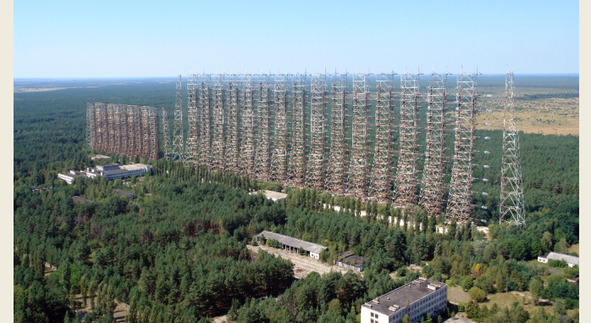 Начинал я свою службу именно с такого зала. Здесь находилось самое главное, что необходимо для любой радио локационной станции. Это, конечно, передающие устройства. В этом зале как раз и рождался сложнейший непрерывный зондирующий сигнал, который потом, после значительного усиления, через антенно фидерные системы, излучался в пространство. Наша работа и заключалась в том, что бы сформировать этот сигнал. А для этого передатчик должен работать четко, как часы. Включения, настройки, поиск неисправностей, регламентные работы – все приходилось делать обслуживающему персоналу – техникам, инженерам, операторам. Работы хватало всем, передатчиков было много. Потом, после первой должности по обслуживанию передающих устройств, я пошел на должность повыше, как раз на этот самый командный пункт, что на снимках слева. На пульте, конечно, работа была и поспокойнее, и проще. Ведь хорошо управлять теми устройствами, на которых работал не один год, и которые прекрасно и хорошо усвоил. По передающим устройствам у меня была квалификация первого класса. А если к этому прибавить ещё и знание командного пункта, то получался мастер боевой квалификации. Да что там говорить, технику мы знали отлично. Этот красивый локатор типа Волга относится к РЛС надгоризонтного обнаружения и сопровождения систем ПРН. Расположен в западной части Европы. В настоящее время видимо заменен аналогичными станциями типа Воронеж, так как старая станция была расположена на территории Украины. А Украина это уже не наша территория. Ещё один из представителей больших систем – станция системы ПРН загоризонтного обнаружения. На верхнем и нижнем снимках показаны совершенно одинаковые РЛС ЗГО. Нижний снимок – это станция ЗГО под Чернобылем, что в киевской области. Бывал я здесь, на академической стажировке, ровно за восемь лет до той, страшной аварии. Да и тема моего академического диплома напрямую соприкасалась с загоризонтной локацией, с этой станцией. Мощнейшие станции по размерам и решаемым задачам.