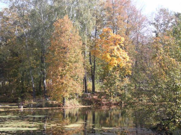 зеленой травой, имеются и осенние, менее яркие, но все равно такие привлекательные и красивые полевые цветы. Выбрался и я как то на осеннюю прогулку. Был ясный и вполне еще теплый сентябрьский день. Побрел проторенным маршрутом – вначале по знакомой березовой роще. Роща встретила меня приветливым шумом уже пожелтевших листьев, что весело трепетали на слабеньком осеннем ветру. Было тепло, тихо и уютно в этой знакомой роще. Под ногами лежали уже пожелтевшие листья с деревьев. Но их было еще совсем немного. Настоящий ковер из осенних листьев осень еще не соткала. Эту работу осень закончит где то к концу октября, к началу ноября. Под ногами еще много зелени встречаются грибы, особенно много ярких и красивых мухоморов. По знакомой тропинке вышел к лесному озеру. Какая прелесть вокруг озера – смешанные деревья, что окружили озеро, начали менять свой наряд. Березка с зеленной листвой приобрела уже и первые осенние цвета, что так ярко выделяются на фоне основного зеленного цвета. Шумит яркая, красочная листва березки, зеленые цвета волнисто и постепенно переходят в яркие золотые цвета под действием легкого осеннего ветерка. Осенняя желтизна уже прихватила и листву векового дуба, что величаво и мощно возвышается на берегу озера со скромной березкой. До чего же красивая эта осенняя картина. На фоне еще зеленого, но уже слегка пожелтевшего камыша с темно коричневыми качалками, раскинулась чистая гладь воды. Ветра нет, вода спокойная и по осеннему чистая до голубизны. Слева раскинулся громадный дуб, листву которого уже слегка тронула осень. А вот березка, что рядом, та почти вся зеленая. Желтизна осени её еще задела совсем, совсем немного. На другом конце озера, вдалеке, виден зеленовато желтый ковер из ряски и облетевших листьев. Прикрыл этот осенний ковер озерную воду. Издали и не видать, что этот ковер на воде. Красочное видение заканчивается желтым великолепием смешанных деревьев, что растут на дальнем, противоположном берегу этого лесного озера. Вот откуда берется это лирическое и такое красочное название этой поры – золотая осень.