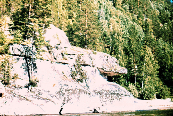 Обтесанная, обкатанная скала противоположного берега Большого порога. Высотой метров двадцать. Показывает, что когда-то давно вода обтачивала её вершину и бока.