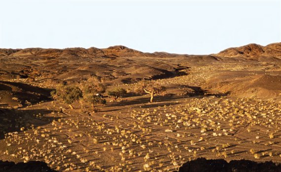 Рис. В. 12. Южная Гоби с ее каменистыми холмами. Группа деревьев теснится к едва заметному источнику воды; здесь находился колодец разрушенного ламаистского монастыря