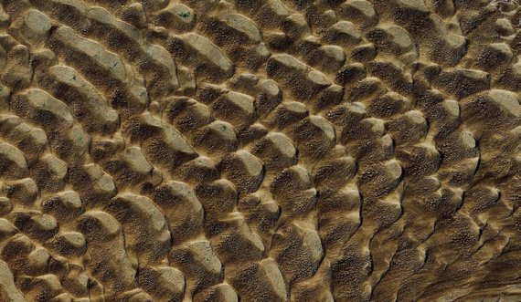 Рис. В. 13. Бесконечные гряды песчаных барханов негостеприимной пустыни Такла-Макан, котловина которой располагается юго-западнее Джунгарских ворот [Google, космическая съемка]. Средняя высота каждого из барханов близка к сотне метров, а некоторые гиганты возносятся даже до трех сотен. Каждый год ветер передвигает песчаные гряды со скоростью 150 м, угрожая существованию редких оазисов. Про эту пустыню молва гласит: «Войти-то в нее – войдешь, да не выйдешь!»