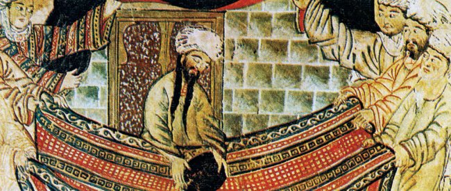 Рис. Пр.1. Пророк Мухаммед поднимает с покрывала святыню святынь всех мусульман – Черный Камень, чтобы вставить его в восточную стену Каабы [Chronik: 237]
