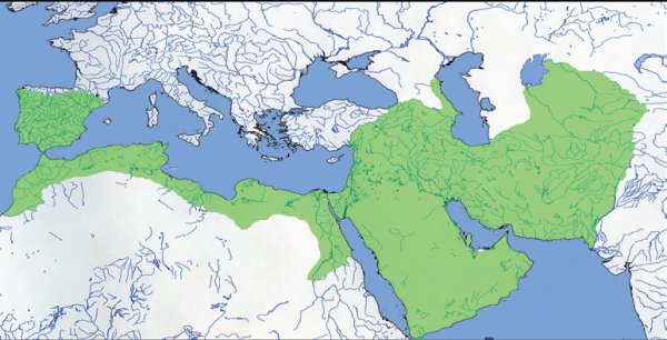 К середине VIII века арабские владения покрыли поражающие своей громадой пространства: не менее 10–11 млн. кв. км! От Пенджаба вплоть до западных окраин Европы и Марокко в Африке и от среднеазиатских пустынь до Среднего Нила (рис. 1.2). И все это удалось совершить за сотню лет, если начать отсчет завоеваний от 632 г., когда Абу-Бакр – первый халиф и наследник пророка Мухаммеда – устремил вдохновленных вновь обретенной верой мусульманских воинов против западных и северных соседей – Сирии и Ирана. Противостоящий миру исламскому мир католический гнездился тогда на пространствах несопоставимо более скромных, не превышавших, кажется, даже одного миллиона кв. км. Общества, где господствовали христианские конфессии восточной ориентации – в Армении, Сирии, – во многом были очень быстро поглощены волной арабских нашествий.