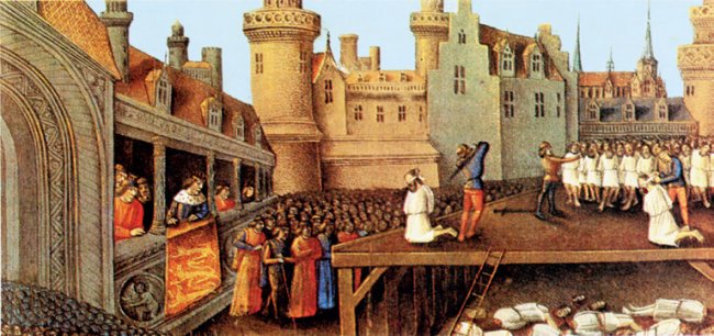 Рис. 1.6. Ричард Львиное сердце со своими приближенными на массовой казни мусульман в Аккре (конечно, может быть и мог английский король разрубить тело противника одним ударом от головы до седла, однако здесь он, кажется, испытывает удовольствие от рубки голов уже палачом). Средневековая миниатюра [Chronik: 305]