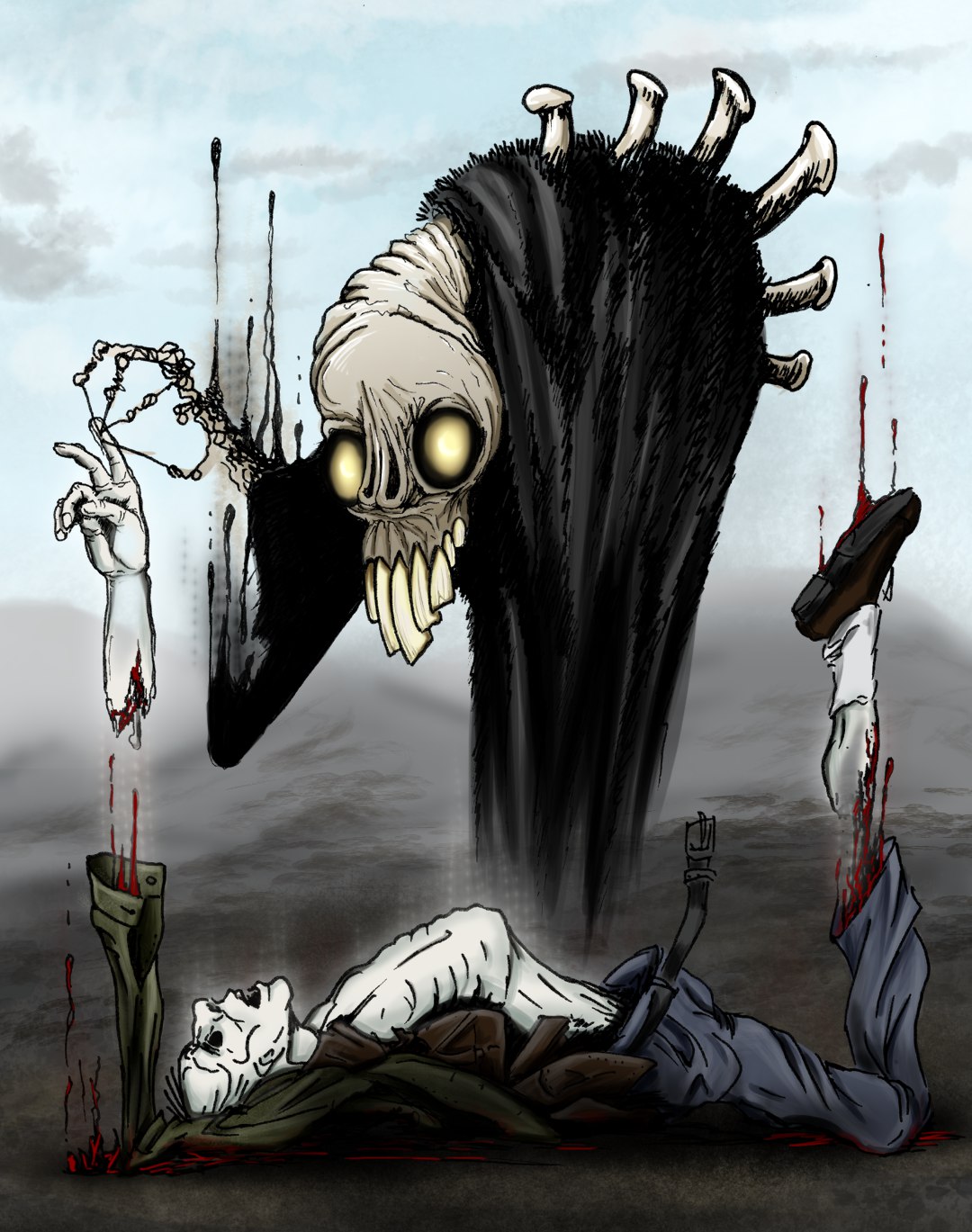 Фигура в чёрном балахоне с широкими разорванными рукавами ходила меж моих бывших спутников и постепенно поднималась по склону. Что-то хрустнуло совсем рядом, и только сейчас я заметил трёх падальщиков, деливших мою правую ногу. Один из них, обнявший бедро, перестал шелестеть, встал на дыбы, обнажив пористое грязно-жёлтое брюхо и, недовольно свистнув, отплыл куда-то в сторону. Его братья встрепенулись, спланировали следом. Собиратель подошёл вплотную и склонился надо мной. Бесцеремонно отломал от облюбованной ноги. Тут наши взгляды встретились. Большие круглые глаза сущности сменили цвет с зелёного на бледно-жёлтый, тонкие губы вытянулись в нитку. Ноздри на маленьком впалом носу раздулись, а под балахоном заметно начала вздыматься и опускаться широкая грудная клетка. Собиратель вытянул руку и выронил на землю плоть, затем попятился, скорчил обиженную гримасу и медленно растаял в воздухе.