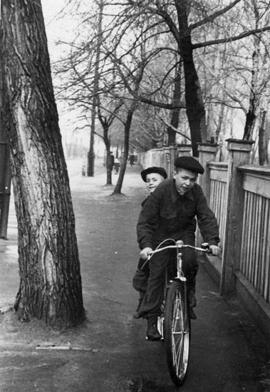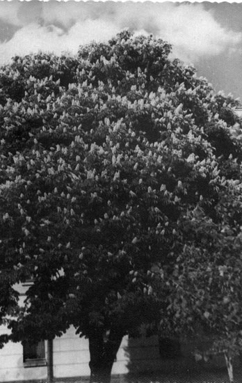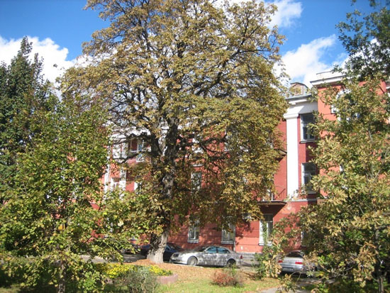 Проезд вдоль главного фасада здания, как и вся улица, был замощен булыжником, а тротуар вдоль дома заасфальтирован. Между проездом и спортплощадками росли высоченные вязы, которые впоследствии спилили ввиду их старости. Пожалуй, единственным немым свидетелем истории, кроме самого здания, разумеется, остался красавец каштан напротив второго подъезда, который растет с незапамятных времен. Во всяком случае, полвека назад он уже был таким, как сейчас. Если бы каштан умел говорить, то от него можно было услышать немало весёлых и не очень историй, которых ему привелось увидеть за столь немалый срок. Он мог бы рассказать, как под огромным раскидистым вязом, на оголившихся корнях которого могла усесться компания из 5–7 ребят, установили детскую песочницу, и ею тут же завладели «детки» школьного возраста, увлечённо соревнуясь в игре в «ножички». А чуть поодаль на стальной перекладине, закреплённой на двух дубовых опорах, осваивали «склёпку» или крутили «солнце» ребята постарше. Потом кто-нибудь из них открывал на полную мощь кран на поливном водопроводе возле фонтана и, подставив ладонь под сливное отверстие, начинал поливать малышню, которая визжала от восторга на весь двор… Каштан, конечно, помнит и то, как я отметил вселение в комнату с балконом (!) в квартире № 4 осенью 1948 года. От переполнявшей меня радости я … плюнул с балкона. Да-а, каштан мог бы о многом порассказать…