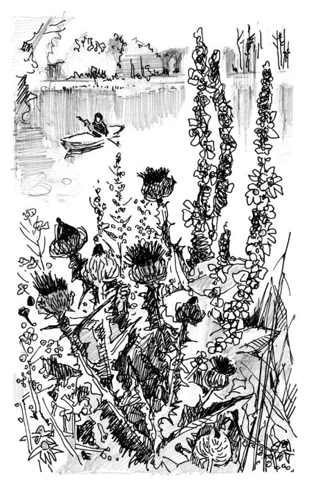 Водная дорога то становится широкой, как автострада, то сужается, как глухой проселок. Берега сдвигаются и заглядывают в лодку. Буйными травами, пышными цветами украсил их Битюг. Высоченные, в руку толщиной дудки перевиты хмелем и вьюнком. Издалека видна в зеленой осоке вишнево-красная плакун-трава, яркая и жизнерадостная, вовсе не похожая на кислую плаксу. Свесились, любуются своим отражением сиреневые астры. Стойко цветет, несмотря на сентябрь, растение с суровым названием «окопник». Словно соревнуясь между собой, берега выставляют напоказ свою красоту. Я включился в эту игру, разделил лист журнала пополам: «берег левый» и «берег правый». Где больше?