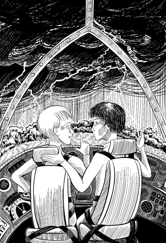 Курс немножко сменил и скорости добавил. Чувствую, как меня в кресло вжало. Скоро впереди мы грозу увидели. Она ночью на Земле, оказывается, жутко страшная и красивая! На Венере грозы я видел, но там у нас как бы полумрак, полной темноты не бывает. А тут – чернота-чернота, как провал в никуда, и вдруг то тут, то там – молнии! Ветвистые, огромные, яркие, и снизу облака подсвечивают, и деревья внизу, и красиво это невероятно. Вроде и сердце в пятки уходит – а где ты ещё такое увидишь? Я даже начал на планшет фото снимать. Вдруг в школе пригодится, да и вообще… Корпус, чувствую, вибрирует, снаружи капли воды барабанят как пулями по корпусу, ветром нас сносит – но гравиинвертор штука серьёзная, чтобы локальное искривление пространства осилить, даже сильного ветра не хватит. Так что с курса не собьёмся!