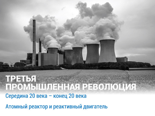 Третья промышленная революция характеризуется прежде всего появлением атомного реактора и реактивного двигателя. Появлением микропроцессора, персональных ЭВМ и суперкомпьютеров. Повсеместно происходит комплексная механизация, автоматизация и информатизация производства, а наука превращается в индустрию знаний.