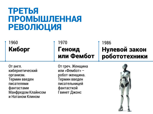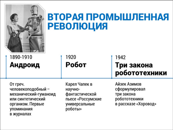 Но! Вторая промышленная революция для нас еще интересна и тем, что в этот период времени появляется первая ЭВМ, а также такие понятия как «андройд», «робот» и «три закона робототехники».