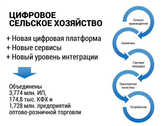 Что в итоге позволяет на базе внедрения новых цифровых платформ объединить 3,774 млн. индивидуальных предпринимателей, 174,8 тыс. крестьянско-фермерских хозяйств и 1,728 млн. предприятий оптово-розничной торговли с одной стороны и миллионы потребителей продукции, с другой стороны.