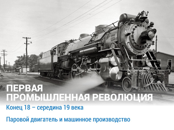 Первая промышленная революция, как Вам многим известно ознаменовалась появлением парового двигателя. Возникновением машинного производства. Появлением железнодорожного транспорта на паровозной тяге и парохода. Появилась так называемая индивидуальная научная деятельность.