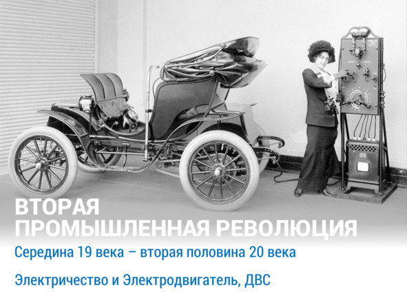 Вторая промышленная революция ознаменовалась появлением электродвигателя и двигателя внутреннего сгорания, производством электроэнергии и электросвязью. Возникновением специализированного научного труда.