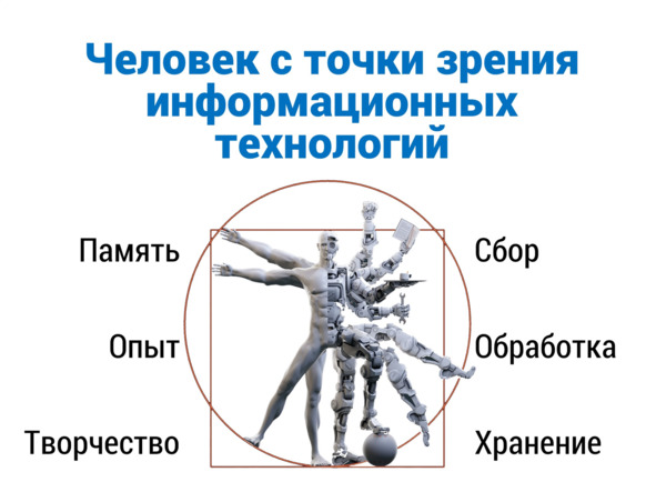 С точки зрения информационных технологий, все, что из себя представляет человек – это «система», в которой собирается, обрабатывается и хранится масса разнородной информации. Всю эту информацию мы с вами называем «наша память», «наш жизненный опыт» и т.д., Кроме того, человек – это еще уникальная система, которая «творчески» формирует алгоритмы получения, обработки и хранения этой информации, и эти алгоритмы тоже хранятся внутри нас, внутри нашей памяти…