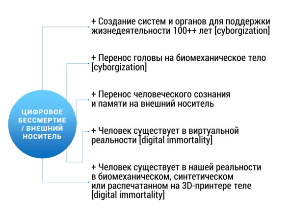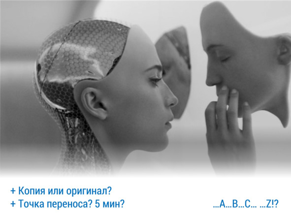 Вот представьте себе ситуацию, что сегодня технологии достигли такого уровня, что способны перенести все эти данные на внешний носитель или, например, сразу в другое тело (телом может служить и некая гибридная биомеханическая система, или робот, или искусственно выращенный, распечатанный на 3D-принтере человек). И таких переносов может быть бесконечное количество раз.