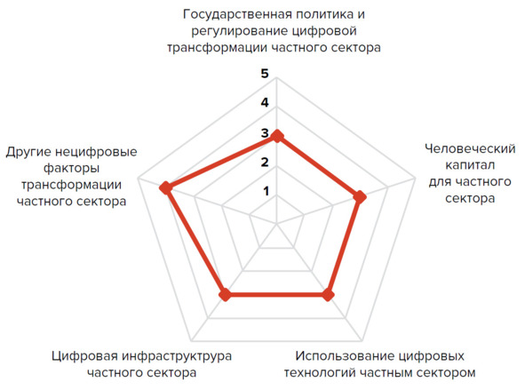 – Цифровая трансформация частного сектора. Включает в себя цифровые и нецифровые факторы, использование традиционных и новых цифровых технологий в частном секторе.