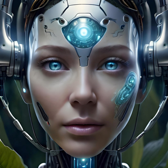 – Введем новый запрос («Prompt»): «Nouvelle AI, new artificial intelligence, cyborg face, an enchanted technological portal from the future, journey into the healing power of nature, photorealistic, perfect composition, cinematic shot, intricate details, hyper detail».