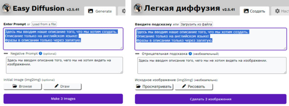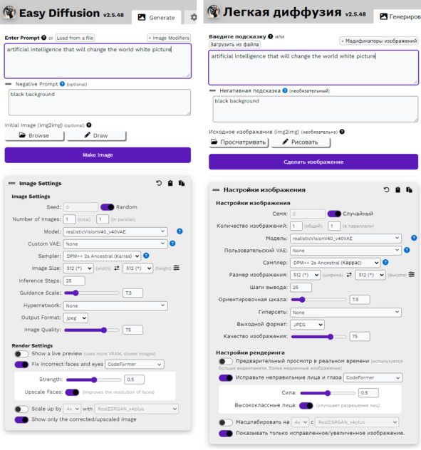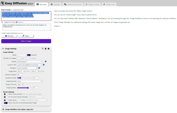 – Остальные параметры Easy Diffusion оставим без изменений.