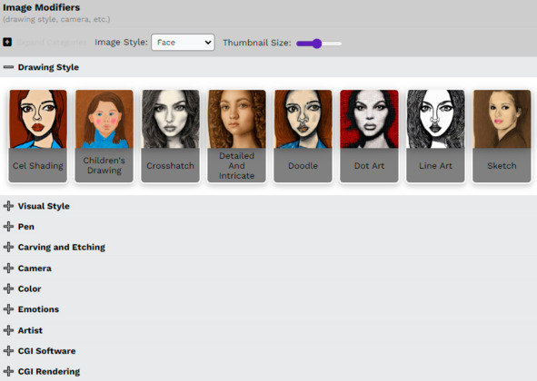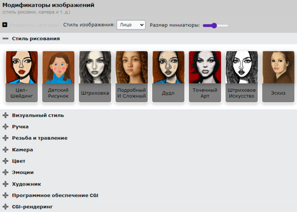 – «Image Modifiers» / «Модификаторы изображения». Очень полезная кнопка, особенно на первых порах, когда вы еще не научились составлять сложные описания новых изображений. В модификаторах вы можете выбрать несколько разных фильтров для своих изображений.