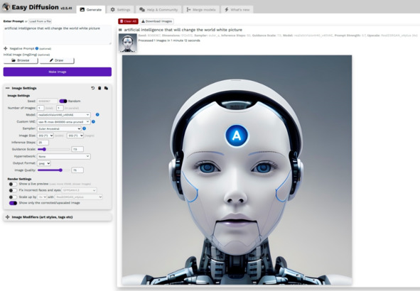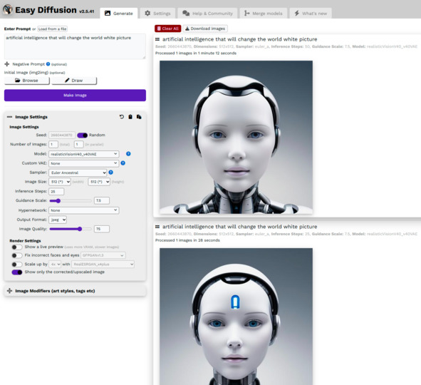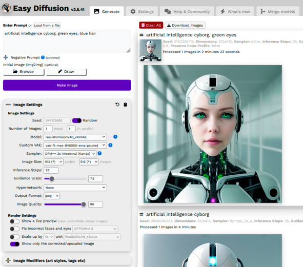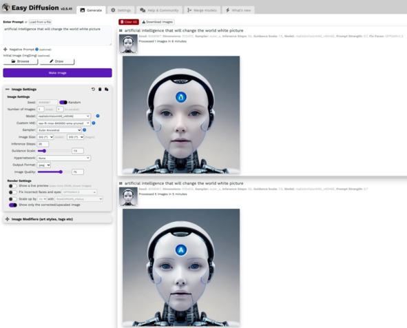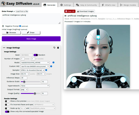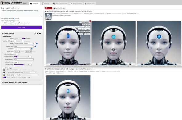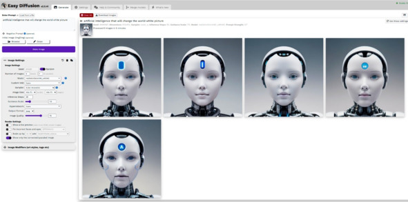 Связано это с тем, что система Easy Diffusion каждый раз будет интерпретировать фразу «Artificial intelligence cyborg» как ей захочется, по причине того что наша ключевая фраза очень простая и носит общий характер, а также требует дополнительных уточнений.
