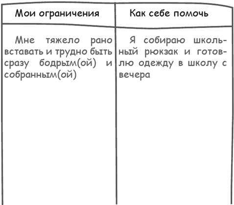 Обращаю твое внимание, что ограничения не делают человека плохим, неспособным, «неправильным» или «хуже других». У каждого из нас есть список собственных ограничений. Они, как и чувства, просто есть. Рамки своих возможностей очень полезно осознавать – но не для того, чтобы за них себя ругать. Вовсе нет! А для того, чтобы с их учетом делать свою жизнь комфортной и продуктивной. Например, моя Даша, зная о своей особенности, может запланировать посещение какого-нибудь людного мероприятия так, чтобы провести на нем не больше часа и обязательно в компании близких друзей, с которыми безопасно. А ее подруге Уле, чтобы ничего не забыть, по ходу чтения нужно делать небольшие пометки, чтобы перед глазами был план текста.