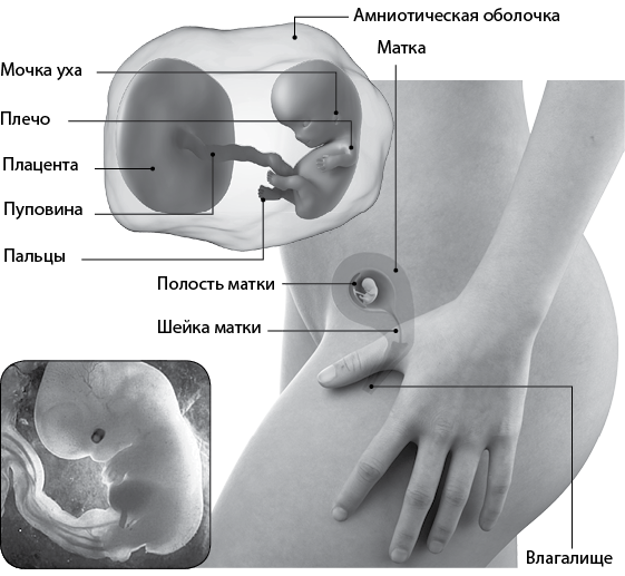 Начинается развитие тонкого кишечника и надпочечников. Происходит закладка почек и мочевого пузыря. Начинает работать печень (она вырабатывает красные кровяные клетки). Формируется лицо. Крошечные конечности удлиняются. Глазки частично прикрыты веками. Между головкой и тельцем образуется сужение – будущая шея. А между ножками выступает бугорок, из которого разовьются наружные половые органы. Длина тельца – 7 мм, масса тела будущего малыша – около 1 грамма.