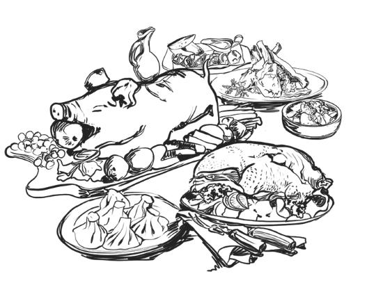 Через некоторое время подали жареных поросят. Борец оторвал половину поросёнка, долго солил и моментально съел, оставив только горстку косточек.