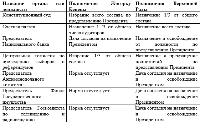 Среди властных структур обоих государств важное место занимает институт президентства. Он сравнительно новый, в Кыргызстане должность Президента введена в 1990 г., в Украине – в 1991 г., не имеет достаточного опыта функционирования, а его введение, особенно в Украине, было сопряжено с ожесточенной политической борьбой. Ведь леворадикальные силы в Украине, отстаивая советскую власть как модель обустройства независимого государства, упорно сопротивлялись введению и конституционному закреплению поста Президента страны. Не найдя в своих политических устремлениях должной поддержки в Верховной Раде, они сосредоточили свое внимание на том, чтобы максимально сократить его полномочия. Как неоднократно заявлял Президент Украины Л. Кучма, он с целью ускорения процесса принятия Конституции шел на значительные уступки левым в Верховной Раде, поэтому полномочия Президента Украины сформулированы значительно уже, чем полномочия Президента Кыргызской Республики.