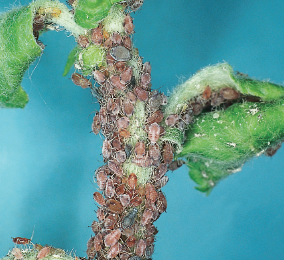 This apple shoot has been deformed by the piercing beaks of hundreds of sap-sucking aphids.