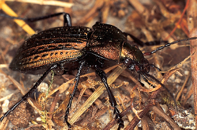 Long, sensitive antennae enable the ground beetle to track down its prey at night.