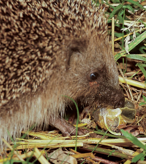A good friend in the garden, this hedgehog is busily polishing off a snail.