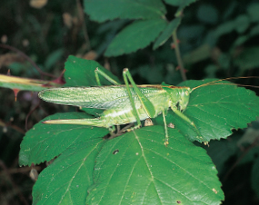 The great green bush-cricket is a noisy inhabitant of the many undisturbed garden hedges and shrubberies that exist both on the European continent and in southern England.