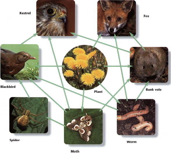 Moth feeds on nectar; spider eats moth; blackbird eats spider. This is a typical food chain. Another example might be plant; insect; vole; fox. Many more such chains can be observed in the garden, and it quickly becomes obvious that these chains are all linked together in a web – because most animals eat more than one kind of food. Blackbirds, for example, are equally happy with earthworms and elderberries, while the bank vole may vary its normally vegetarian diet with snails and fungi as well as insects. Just a few of the chains in a garden food web are illustrated here, with the arrows pointing from the food to the consumers. You will find that each chain starts with a plant. With each species kept in check by its predators and/or food supplies, the whole community remains in a healthy equilibrium.