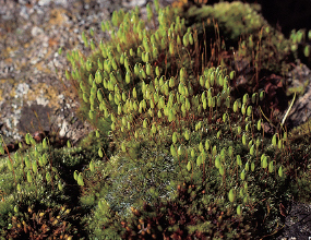 Tiny mosses, seen here covered with pear-shaped spore capsules, erupt from the smallest cracks in walls and paths.
