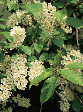Bird cherry is an excellent tree for the wild garden. It can reach a height of 15m (45ft), but it does not cast a dense shade and it is easily kept in check by regular trimming. Laden with heavily-scented flowers in spring, the bird cherry bears shiny black fruits later in the year.