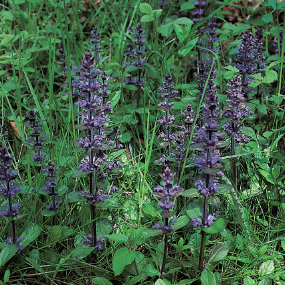Bugle makes a colourful edging to a garden path in the spring. The wild form and the various cultivars are equally attractive to bees.