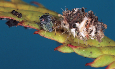 Re-cycling the empties: this lacewing larva, pictured with its jaws plunged into an aphid, camouflages itself by piling the empty skins of its victims on its back.